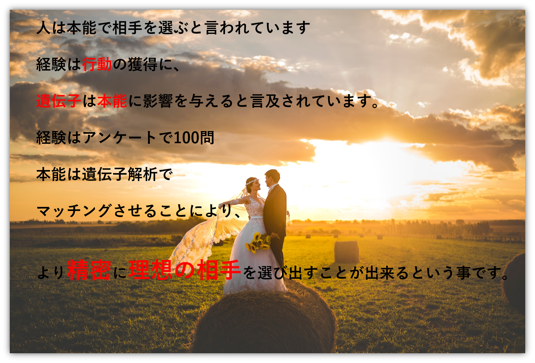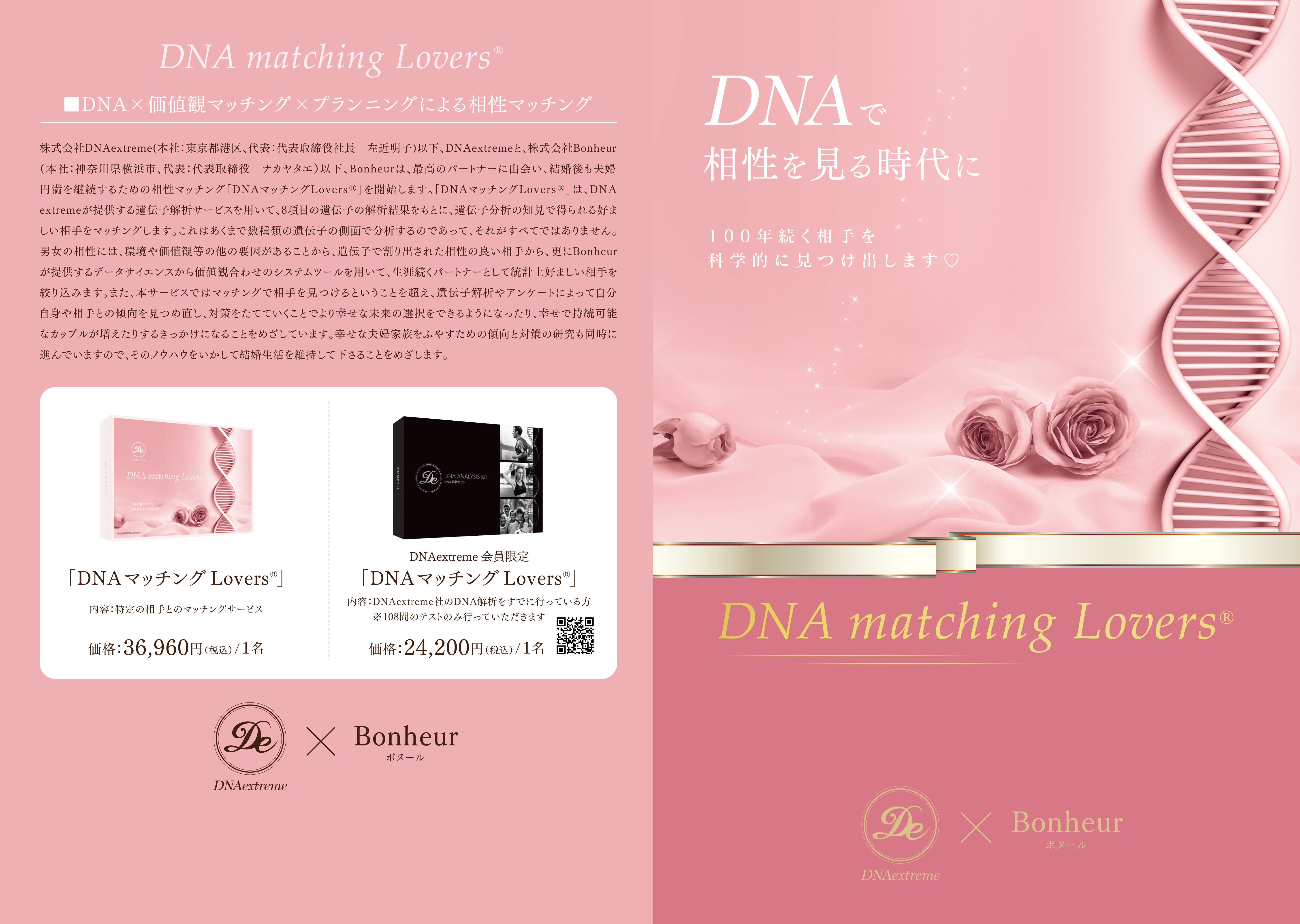 株式会社DNAextreme(本社:東京都港区、代表:代表取締役社長 左近明子)以下、DNAextremeと、株式会社Bonheur(本社:神奈川県横浜市、代表:代表取締役 ナカヤタエ)以下、Bonheur)は、最高のパートナーに出会い、結婚後も夫婦円満を継続するための婚活支援サービス「DNAマッチングLovers」を開始しました。「DNAマッチングLovers」は、DNAextremeが提供する遺伝子解析サービスを用いて、8項目の遺伝子の解析結果をもとに、遺伝子分析の知見で得られる好ましい相手をマッチングします。これはあくまで数種類の遺伝子の側面で分析するのであって、それがすべてではありません。男女の相性には、環境や価値観等の他の要因があることから、遺伝子で割り出された相性の良い相手から、更にBonheurが提供するデータサイエンスから価値観合わせのシステムツールを用いて、生涯続くパートナーとして統計上好ましい相手を絞り込みます。
