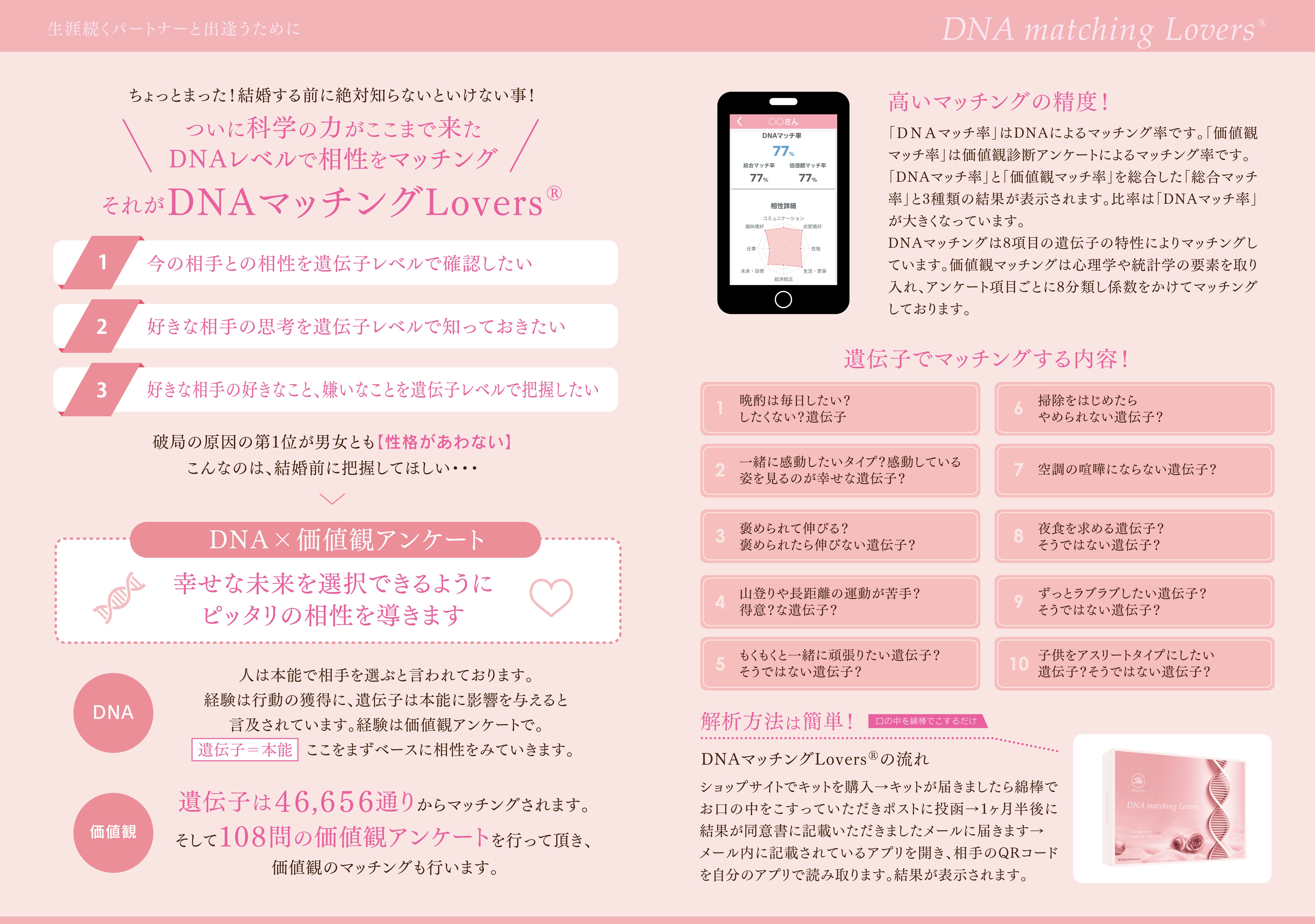 内容:遺伝子解析とデータベースからの価値観合わせによる相性診断サービス